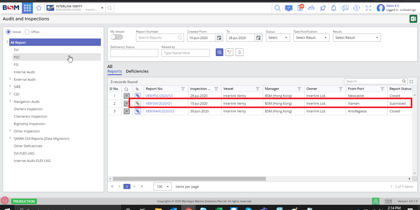 1. Audit and Inspection Page : Select the report for which the report deficiency has to be added.