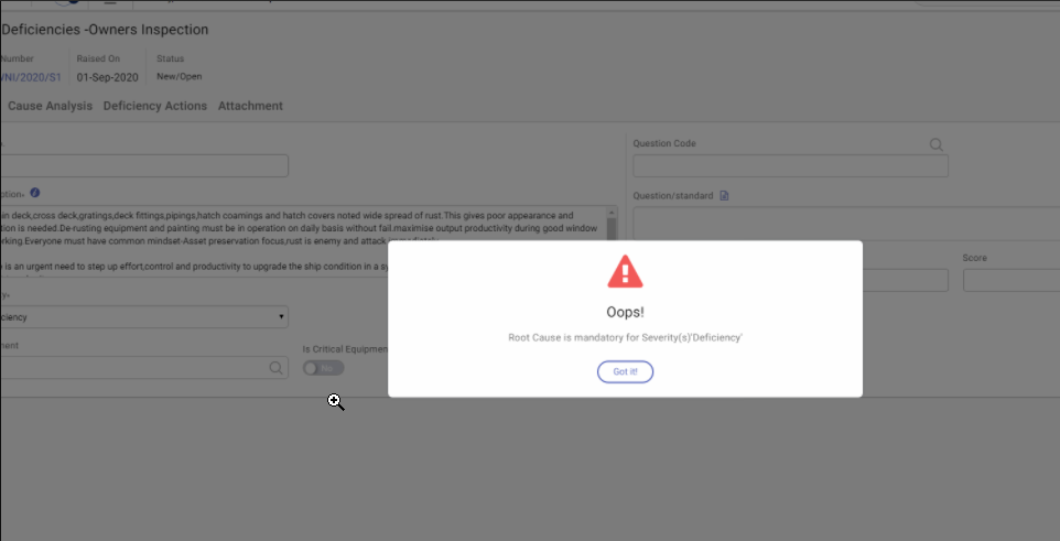 In order to save a deficiency, it is mandatory to have Basic/Root cause details in Audit and Inspection.