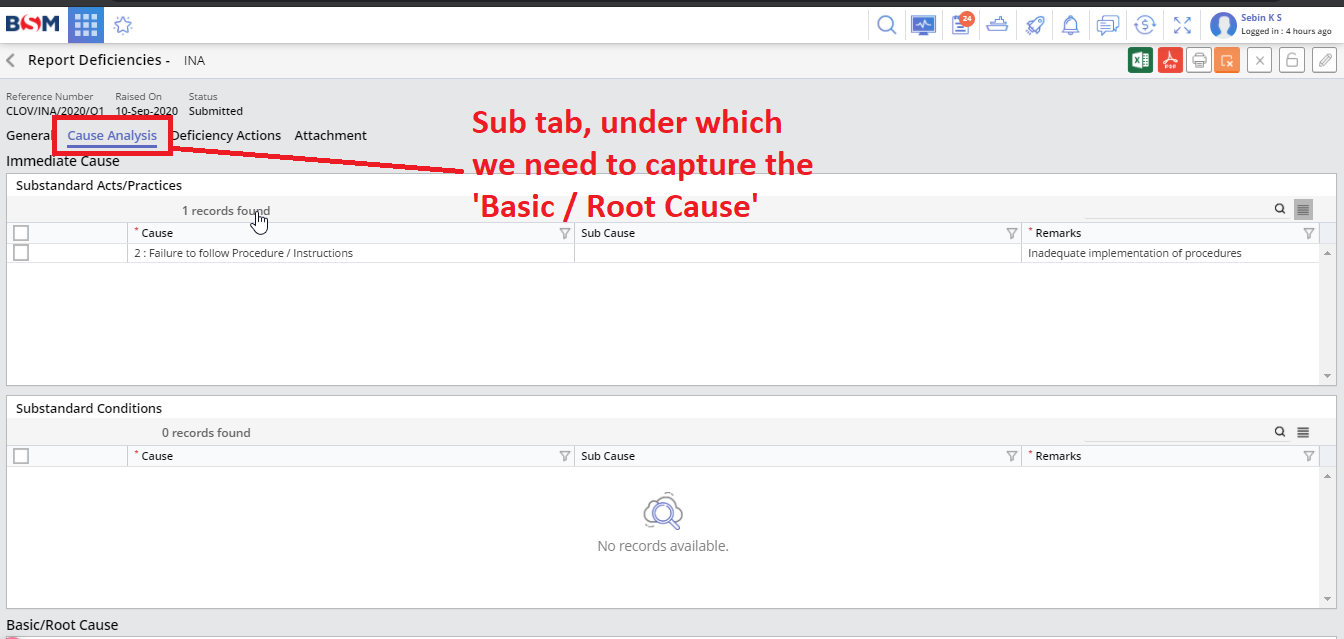 Under the Cause Analysis tab under deficiencies we need to capture the 'Basic / Root Cause' :