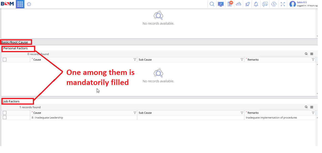 The Basic/Root Cause is governed by two factors, Personal Factor and the Job Factor. User must select one of the factor mandatorily to save.