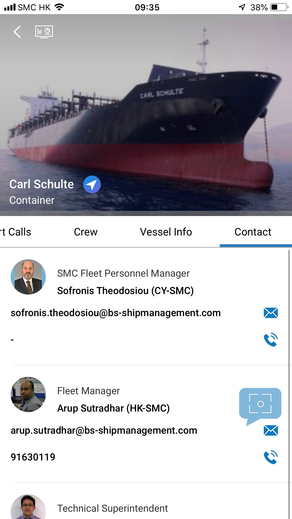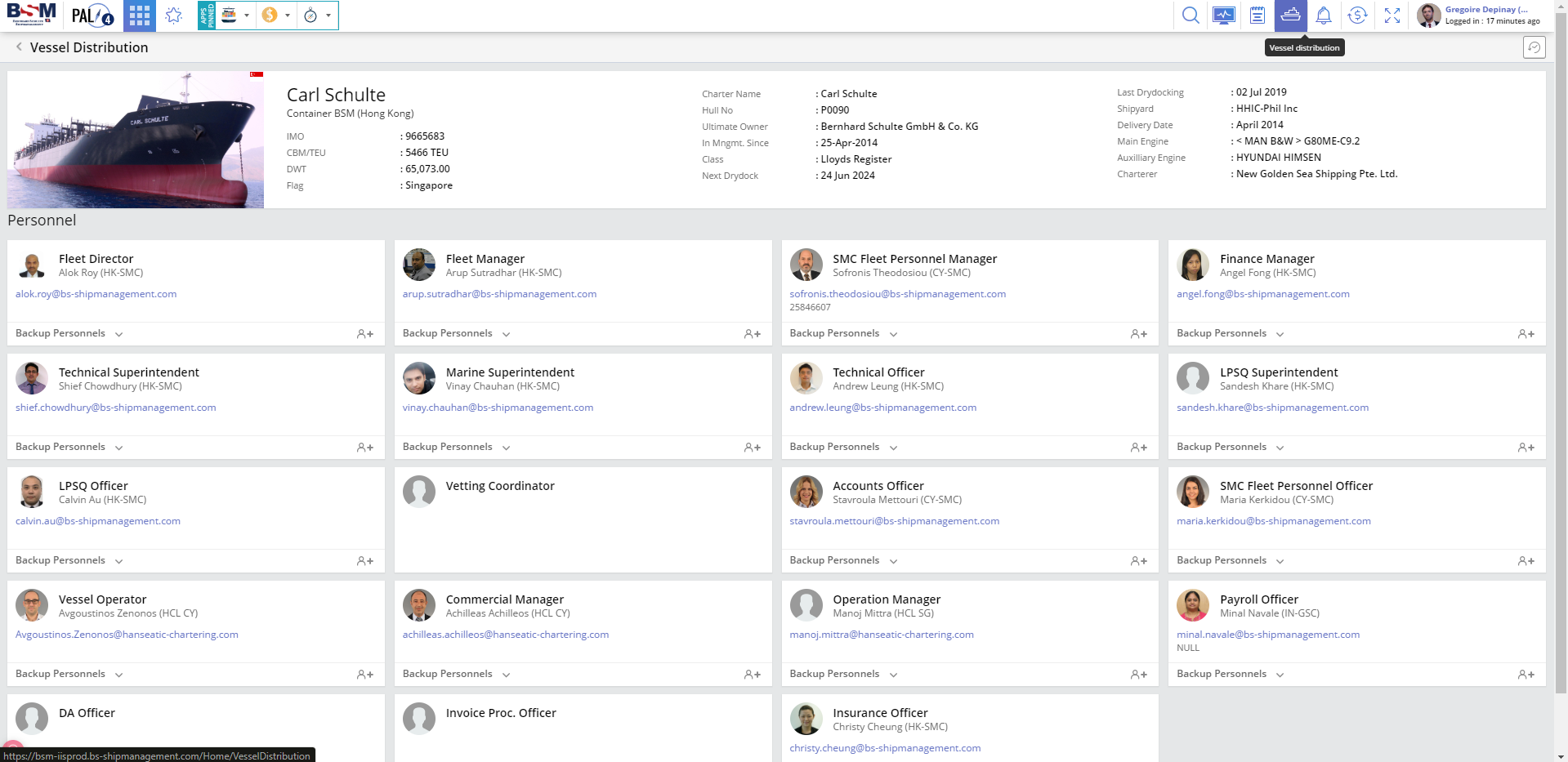 For each vessel, the contact tab displays the following contacts: